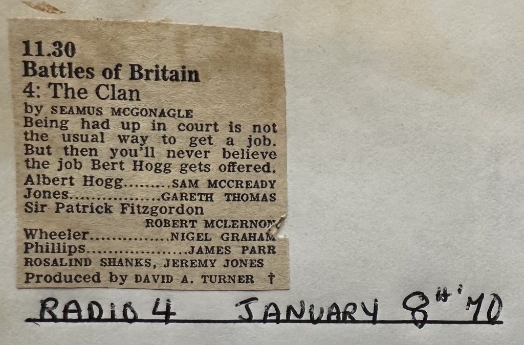 His earliest documented role on radio was in 1970. Gareth played a character called Jones in episode 4 of a series entitled Battles of Britain. “The Clan” was written by Seamus McGonagle:
