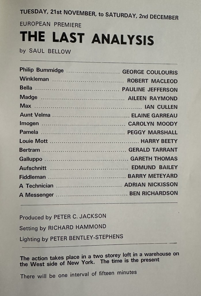 There followed Saul Bellow’s The Last Analysis, presented 21st November to the 2nd December:
