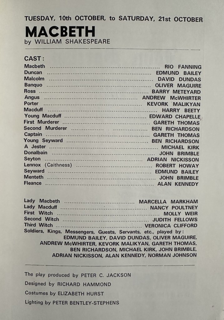 Shakespeare’s Macbeth, which ran between the 10th and the 21st October 1967, for which there is a programme: